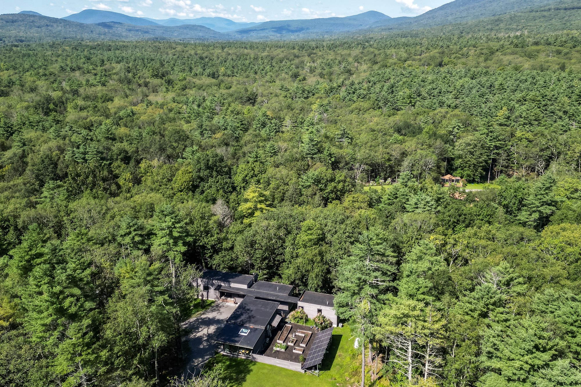 Welcome to a home where contemporary elegance seamlessly blends with the tranquil beauty of nature. Nestled among lush greenery and towering pines, this stunning residence, worthy of features in top architectural publications, offers an unmatched living experience. At the end of a quiet, winding drive, this property reveals breathtaking views of a dramatic wooded hillside cascading down to a serene, flowing stream. Unique features such as the glass-walled container pool and the year-round hot tub make this property truly one-of-a-kind.
