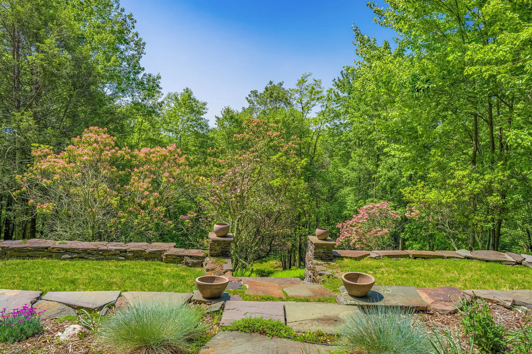 Upstairs, the tranquil primary suite is tucked beneath the pitched roofline, painted entirely in white and imbued with serene charm. Open the windows and fall asleep to the gentle sounds of a year-round stream that flows nearby, serenading both bedrooms with nature’s lullaby. The surrounding grounds have been lovingly cultivated for both play and reflection. A former pool has been transformed into a soft, grassy knoll—perfect for lawn games, picnics, or quiet lounging under the sun.
